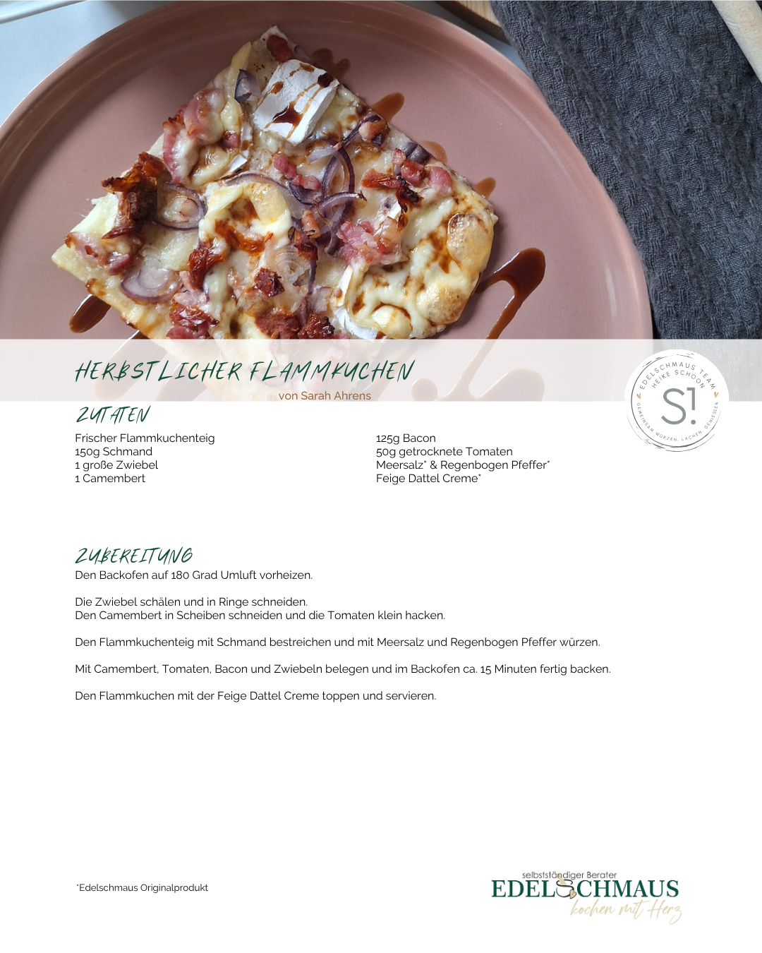 Den Flammkuchen mit der Feige Dattel Creme toppen und servieren.