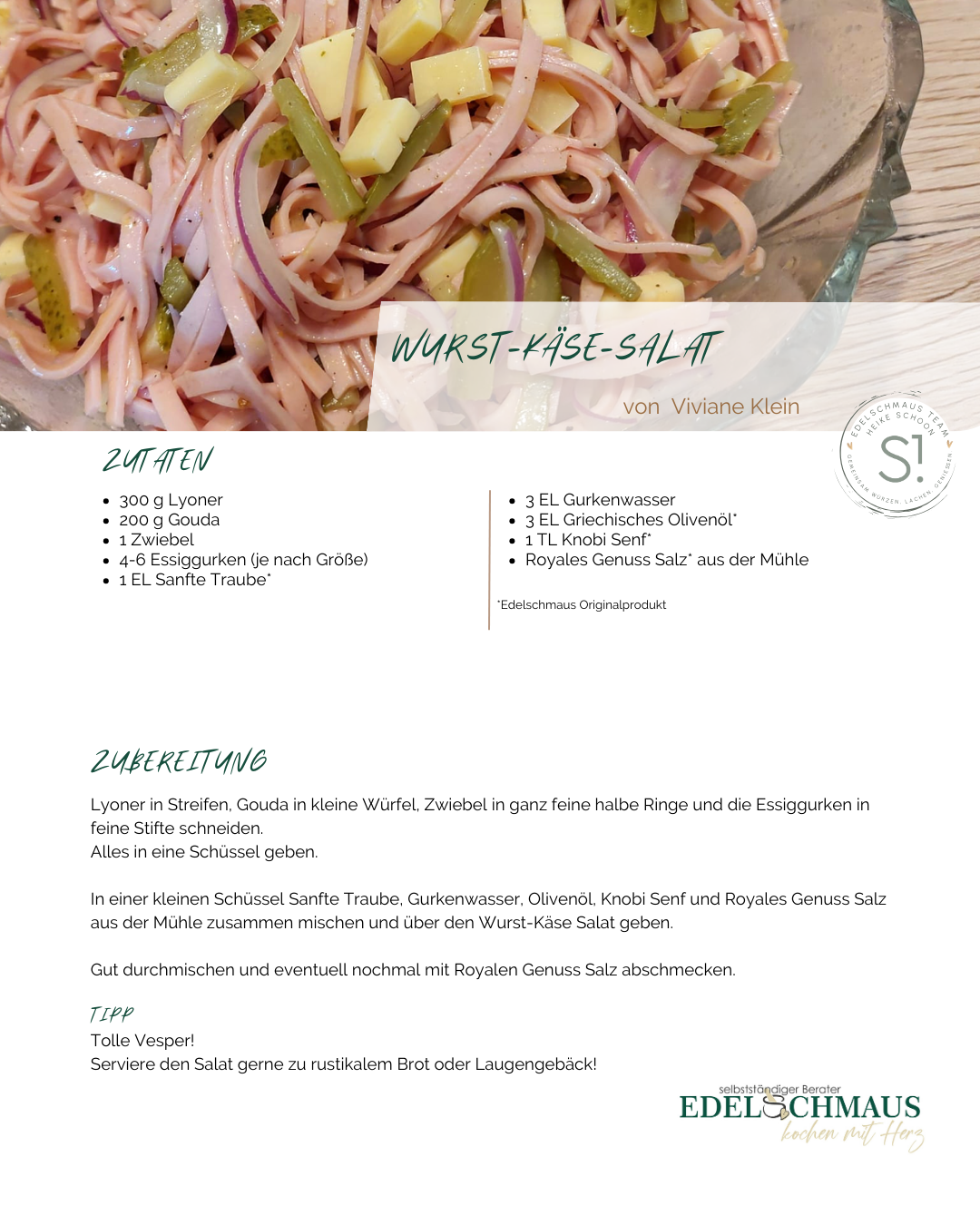 In einer kleinen Schüssel Sanfte Traube, Gurkenwasser, Olivenöl, Knobi Senf und Royales Genuss Salz aus der Mühle zusammen mischen und über den Wurst-Käse Salat geben.