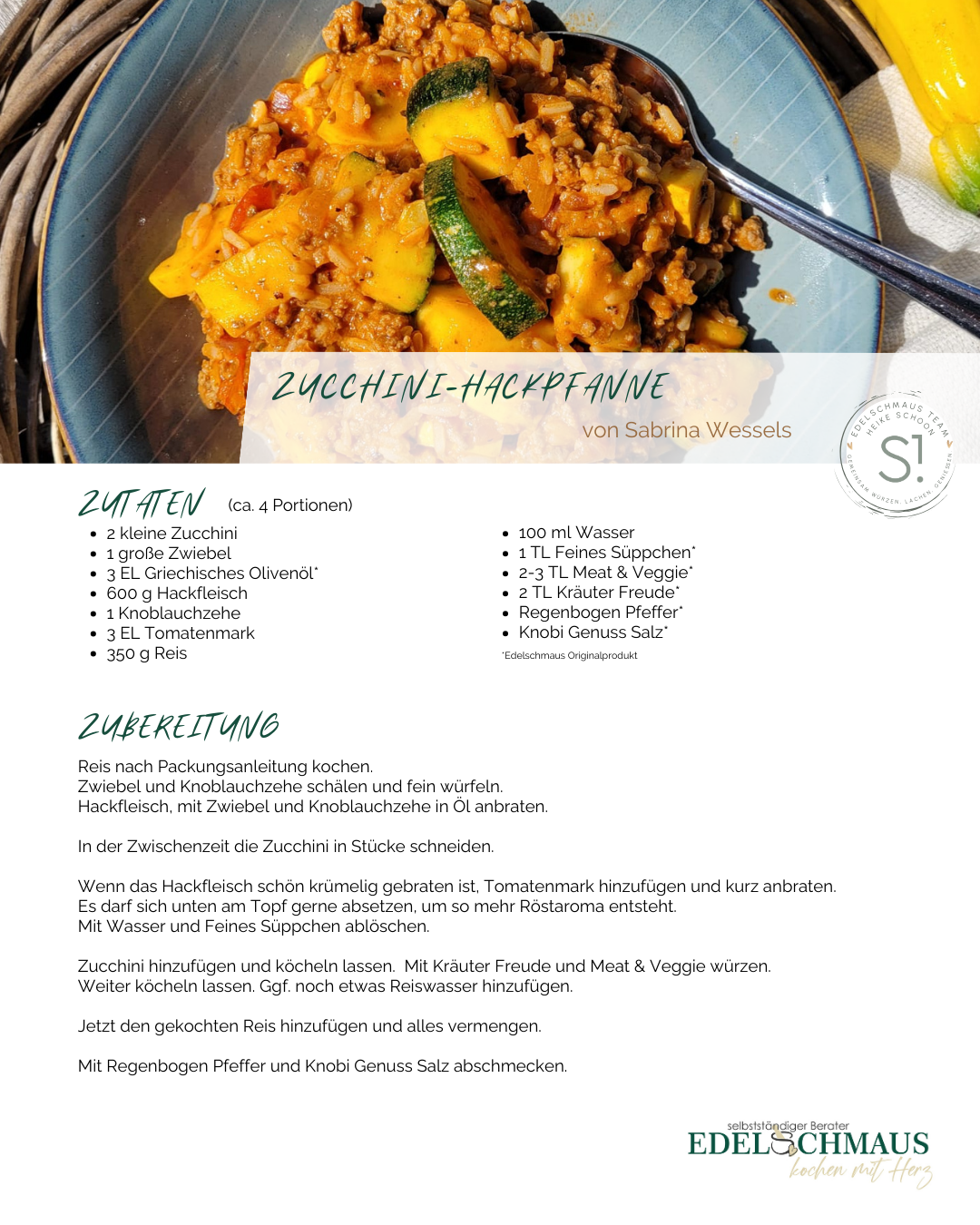 Zucchini hinzufügen und köcheln lassen. Mit Kräuter Freude und Meat & Veggie würzen.